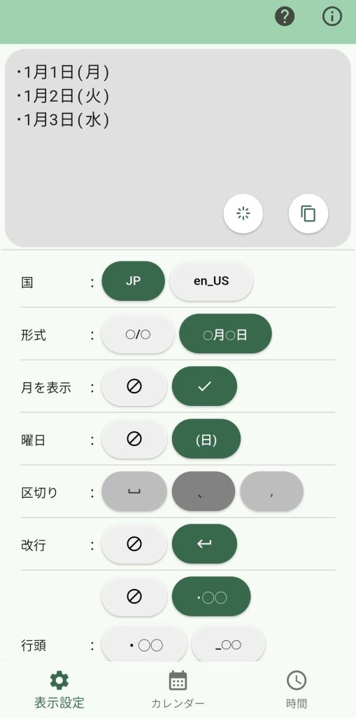 カレコピ カレコピ X Facebook Hatena Bookmark LINE Pinterest Copy 2025.11.292026.02.23 カレンダーから好みの形式で日時をコピーできます。 メッセンジャーアプリなどで日付を伝えたい時、日付と曜日を間違わないか気を使いますよね。このアプリでカレンダーから選択することでミスがなくなります。ビジネスでの日程調整は調整アプリを用いるのが主流ですが、気軽に日付を伝えたい時やメール上でしか調整ができない相手とやりとりするときであればこのアプリを使って伝達のミスを無くすことができます。 プライバシーポリシー